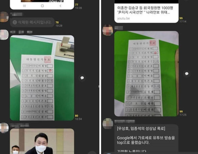 윤석열을 사랑하는 단체'(윤사단) 카카오톡 대화방에는 윤 후보 지지자인 박아무개씨와 정아무개씨, '석○·공○·예○'라는 아이디를 쓰는 유권자가 윤 후보에게 기표한 투표지 사진을 올렸다