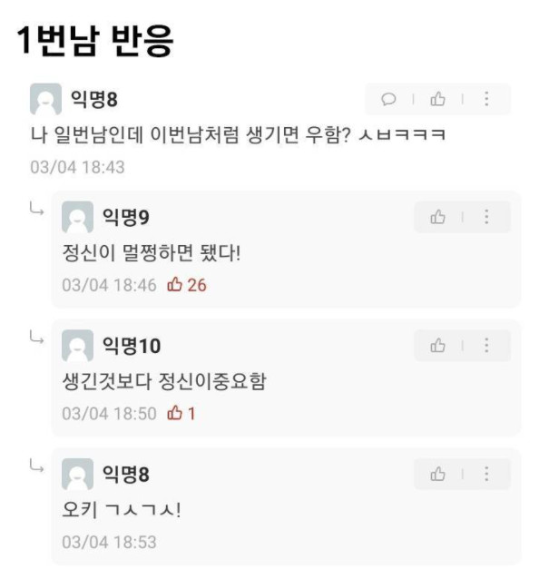 1번남 : 오래 연애 중인 남자, 친구가 많은 남자, 불평 불만을 입에 달고 다니지 않는 남자....납득, 이해, 수용 잘함, 못생김을 수용