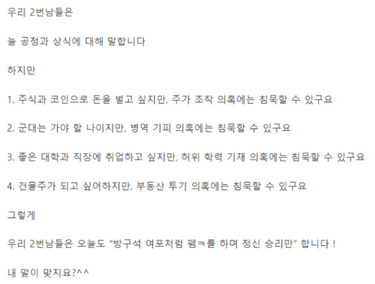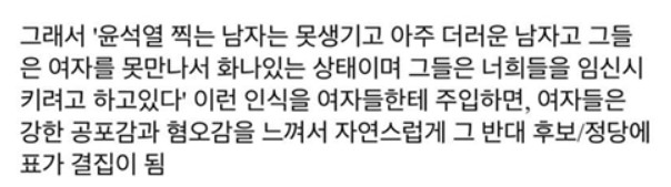 현실에서 윤석열을 응원하는 말을 대 놓고 하는 2번남은 거의 찾아 보기 힘들다고 한다.