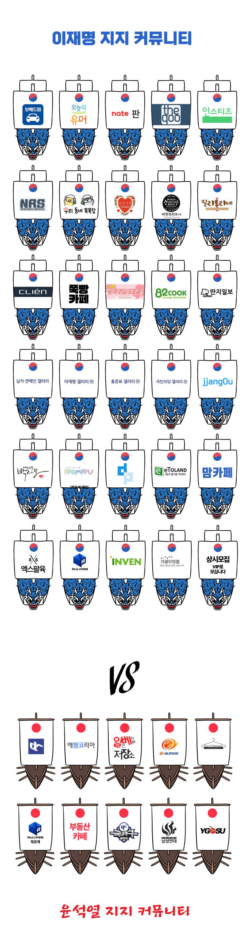 보배드림, 오유, 판, 더쿠(여), 인스티즈(여), NRS, 우리동네목욕탕, 이종격투기카페, 밀리트리네, 클레앙, 쪽빵카페, 방석위로모여라(여), 82쿡(여), 여시(여), 딴지, 남연갤,이재명갤,홍준표갤,국민의당갤, jjangOu(짱공유), 박사모, 뽐뿌, dp, 이토랜드, 맘카페, 인벤, x86, 싸줄, 가생이닷컴