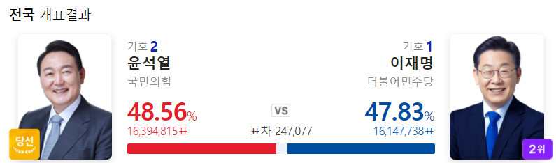 윤석열과 이재명의 표차는 247,077표 차이입니다.