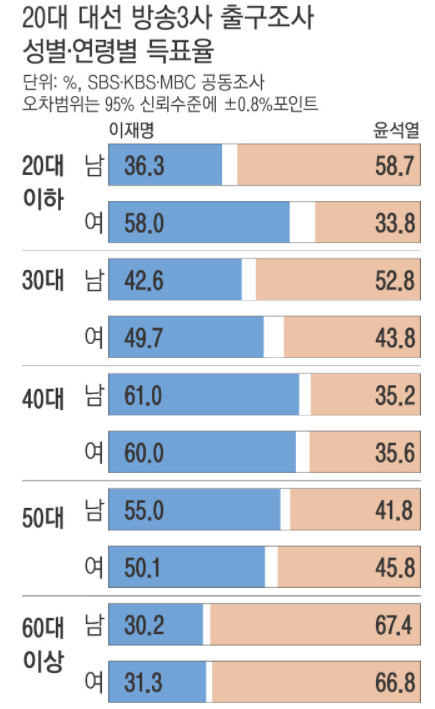 이대남 : 이재명 36.3% / 윤석열 58.7%