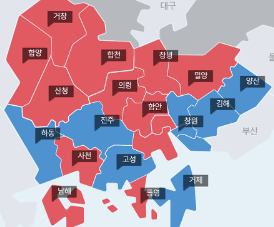 하동, 진주, 고성, 창원의 지지율이 바뀌었고