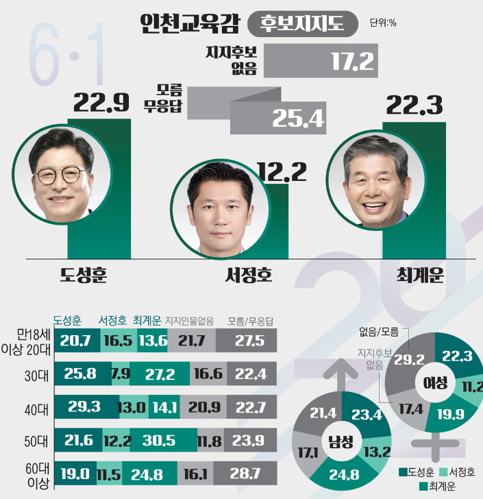 현재 인천교육감 후보 지지율은 도성훈과 최계운의 초박빙 상황.