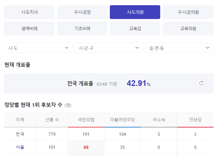 예상은 했다. 그런데 경기도가 초박빙으로 가고 있고, 인천까지 질줄은 몰랐다. 경기도 전라도와 제주 빼고는 시.도지사 선거는 전지역이 다 빨간 국힘당이다. 민주당이 받아든 전체 선거결과를