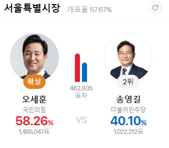 송영길은 관악구 지역 한 곳 빼고는 모든 지역을 다 진 것으로 나타나고 있어