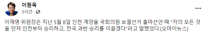 이름모를 수박 민주당 국회원은 "총괄선대위원장이 당을 위해 희생해야 하는데, 이번엔 반대로 당이 희생한 선거였다", " 민주당이 이 위원장에게 대선과 지방선거, 총 두 번의 기회를 주었는데도 결국엔 패배하고 만 꼴”이라며 “대선과 지방선거까지 합쳐서 책임론을 제기할 때가 됐다"