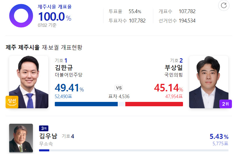 제주시을 보궐선거에서 김한규가 당선이 되었다.