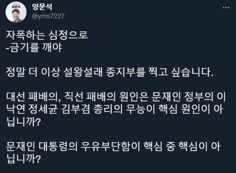 대선패배, 지선패배의 핵심에 대해 문재인대통령을 거론하는 것이 금기어가 되었었다.