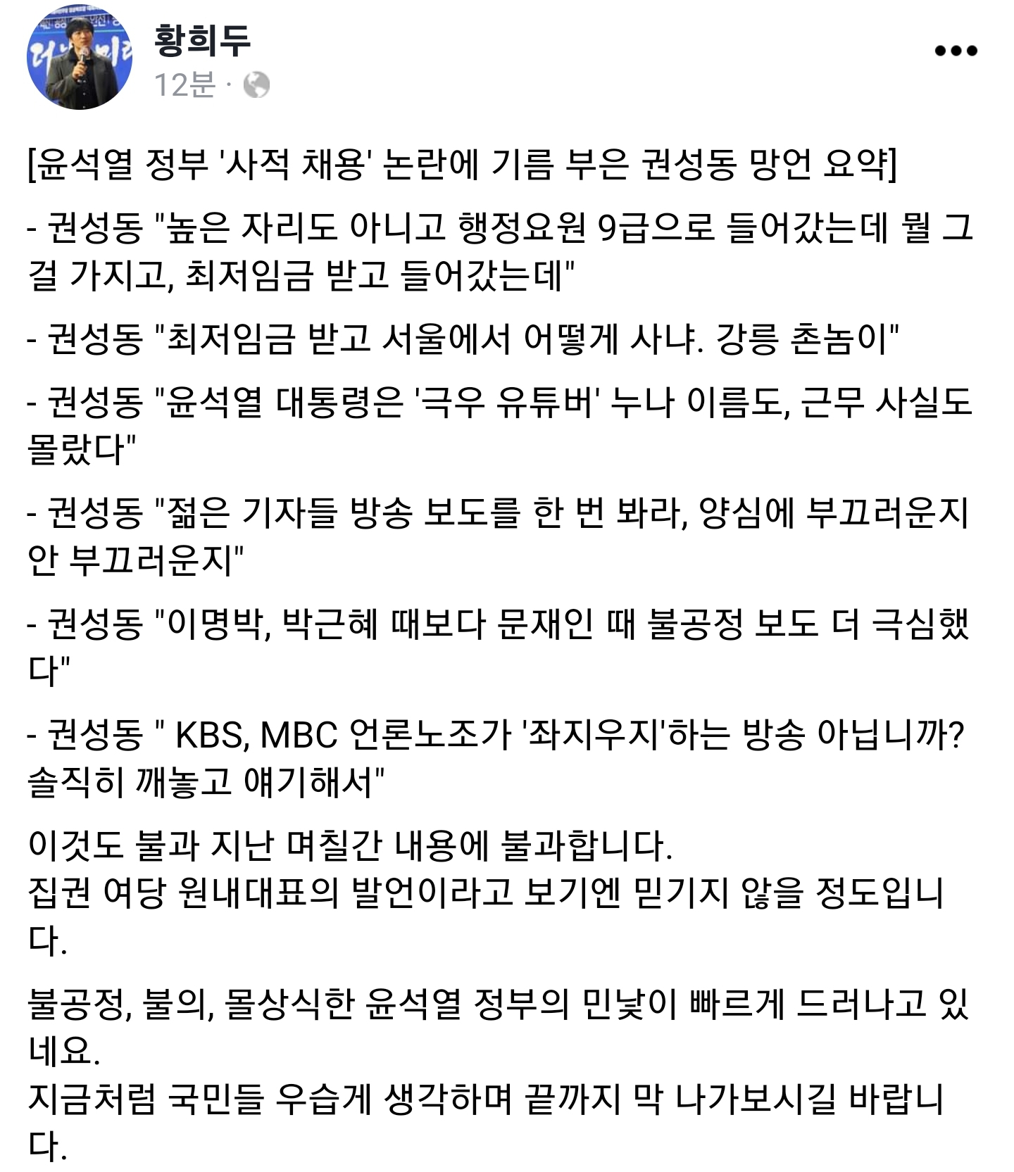 권성동이 7급에 꽂은 줄 알았는데 9급에 꽂아 줬다고 별일 아니라는 투로 말을 했어, 참 후안무치한 것들이다.