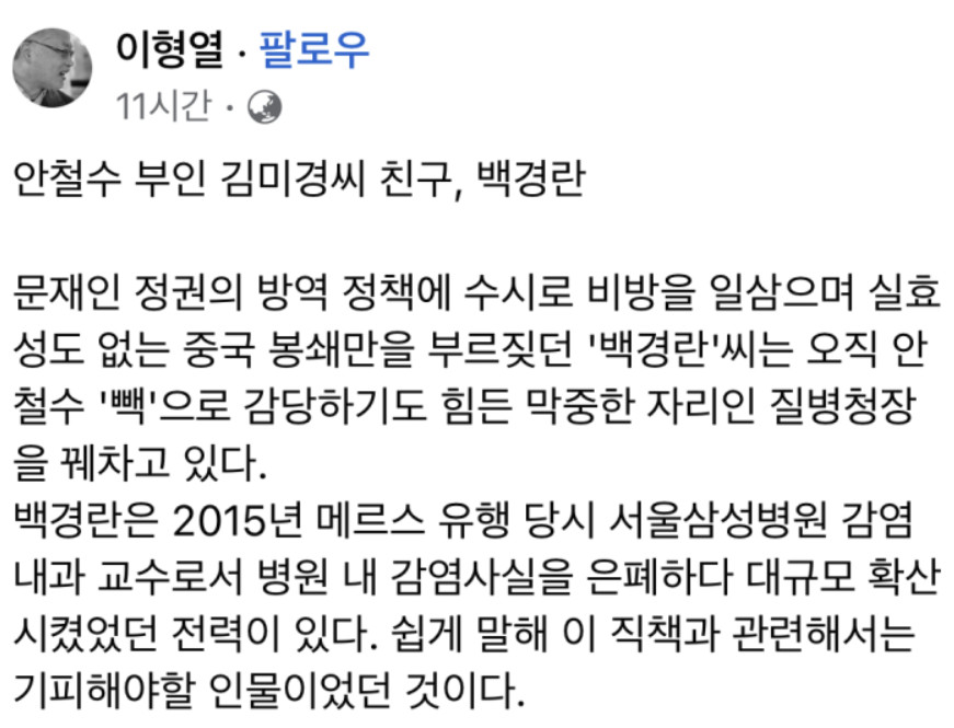 현 질병청장 백경란 때문도 크죠.