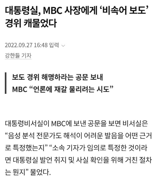 대통령실은 mbc에 공문까지 보내어서 압박한다.