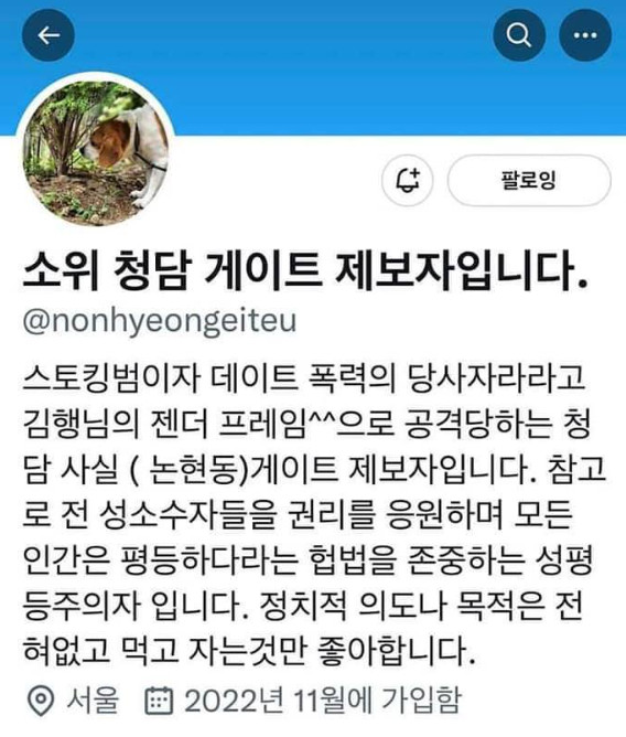 스토킹범이자 데이트 폭력의 당사자라라고 김행님의 젠더 프레임^^으로 공격당하는 청담 사실 ( 논현동)게이트 제보자입니다. 참고로 전 성소수자들의 권리를 응원하며 모든 인간은 평등하다라