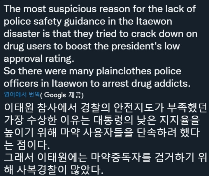 공안정국과 검찰수사권을 다시 가져오기 위한 작업이 필요했고 첫번째로 윤석열, 한동훈은 최근 마약청정국이 아니다면서 열변을 토해 왔고 이태원참사 전날 28일 마약 검사키트를 대량 구매한 증거가 나왔다.