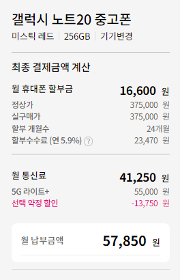5G 라이트+를 사용한다고 하면 공시지원금에 추가지원금까지 나오고 그럼 폰 가격은 이자 3천원 포함 48,400원에 구매하는 꼴이더라고, 선약도 비슷해.