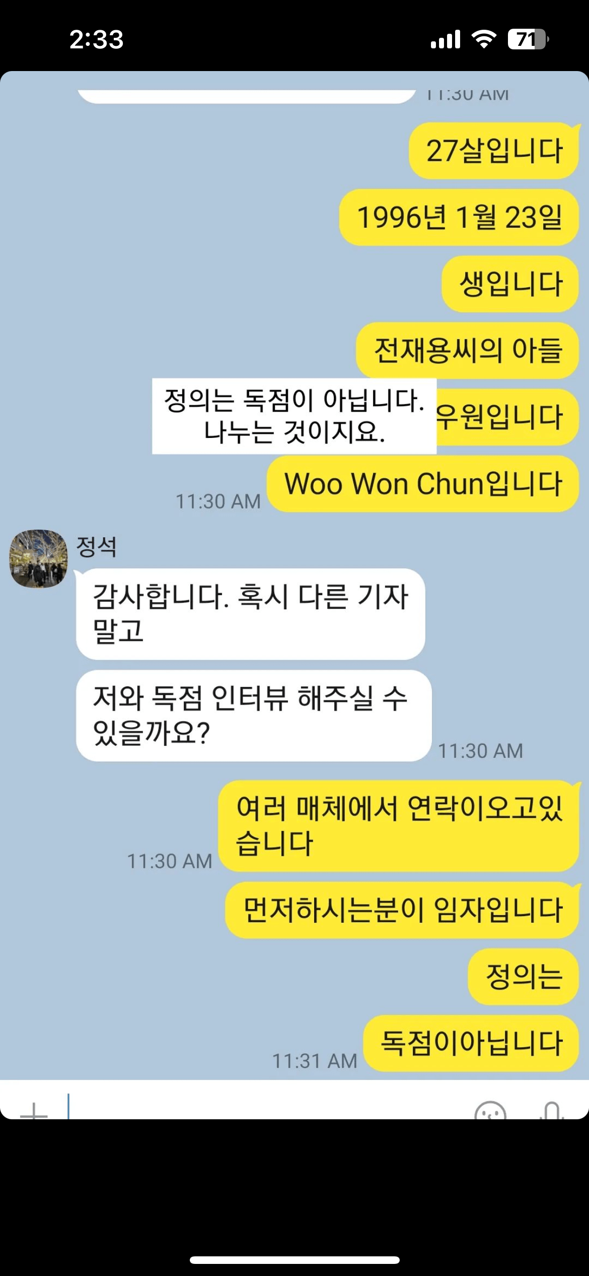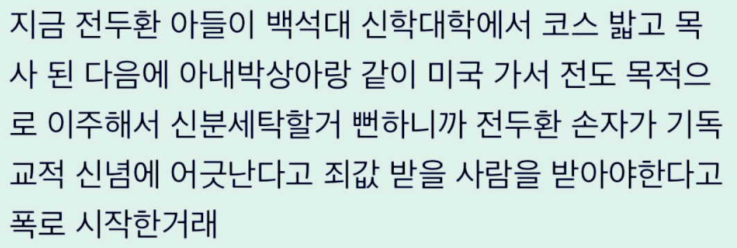 저는 전두환 전 대통령의 손자이자 전재용씨 아들로 저는 현재 뉴욕 한영회계법인 파르테논 전략컨설팅 부서에 일을 하고 있다. 이 자리에서 제 가족들이 행하고 있을 범죄 사기 행각을 밝히는데 도움이 되기 위해서 폭로한다.