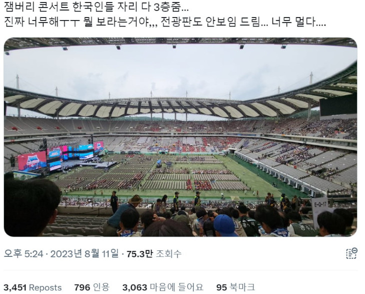 https://garuda.tistory.com/3590 [잼버리 개판4] 잼버리 k팝 콘서트 뒷 이야기 모음 한국인들은 거의 안 보이는 3층에 배치 무대 앞 좌석은 어느나라일까? 어떤 이는 선착순이었다는 말도 있고 미리 배