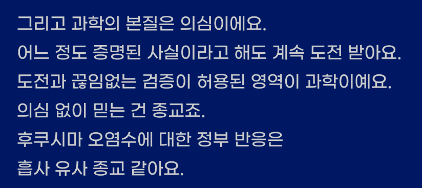 "과학적 근거들 들어 방류를 지지하는 평가도 있지만 역시 근거를 들어 우려하는 목소리도 큽니다.우려를 괴담으로 치부하기보다 괴담이 현실이 되지 않도록 다양한 견해를 고려하는 게 과학적 대처에 더 가까워 보입니다."