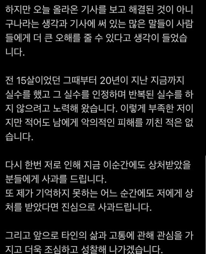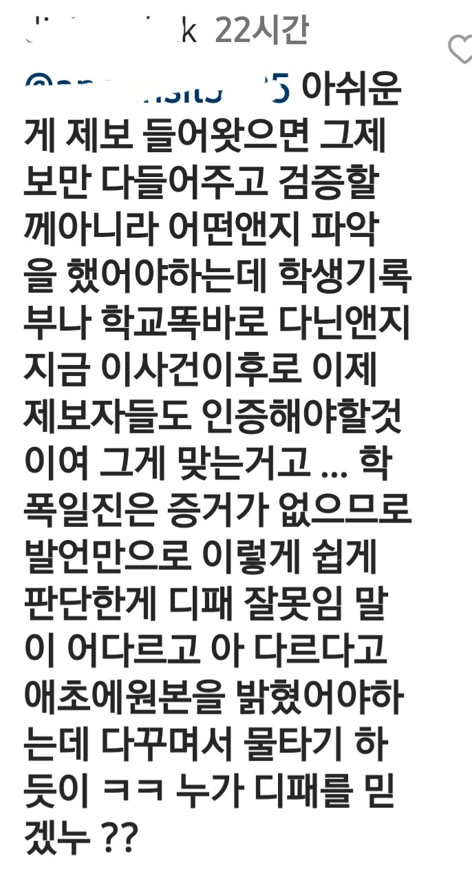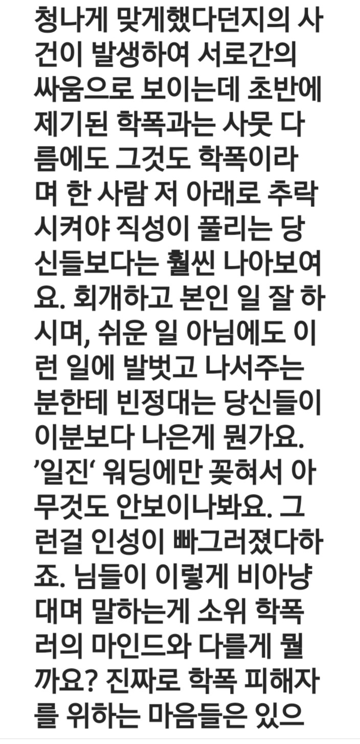 그 중에 날 직접적으로 때린 사람이 두 명이다. 어떻게 가해자를 피해자로 둔갑시킬 수가 있나. 지금 상황은 오히려 가해자가 학폭 피해자 행세를 하고 있는 꼴”이라며 “그 자체가 내겐 2차 가해로 느껴져서 심적으로 괴롭다”