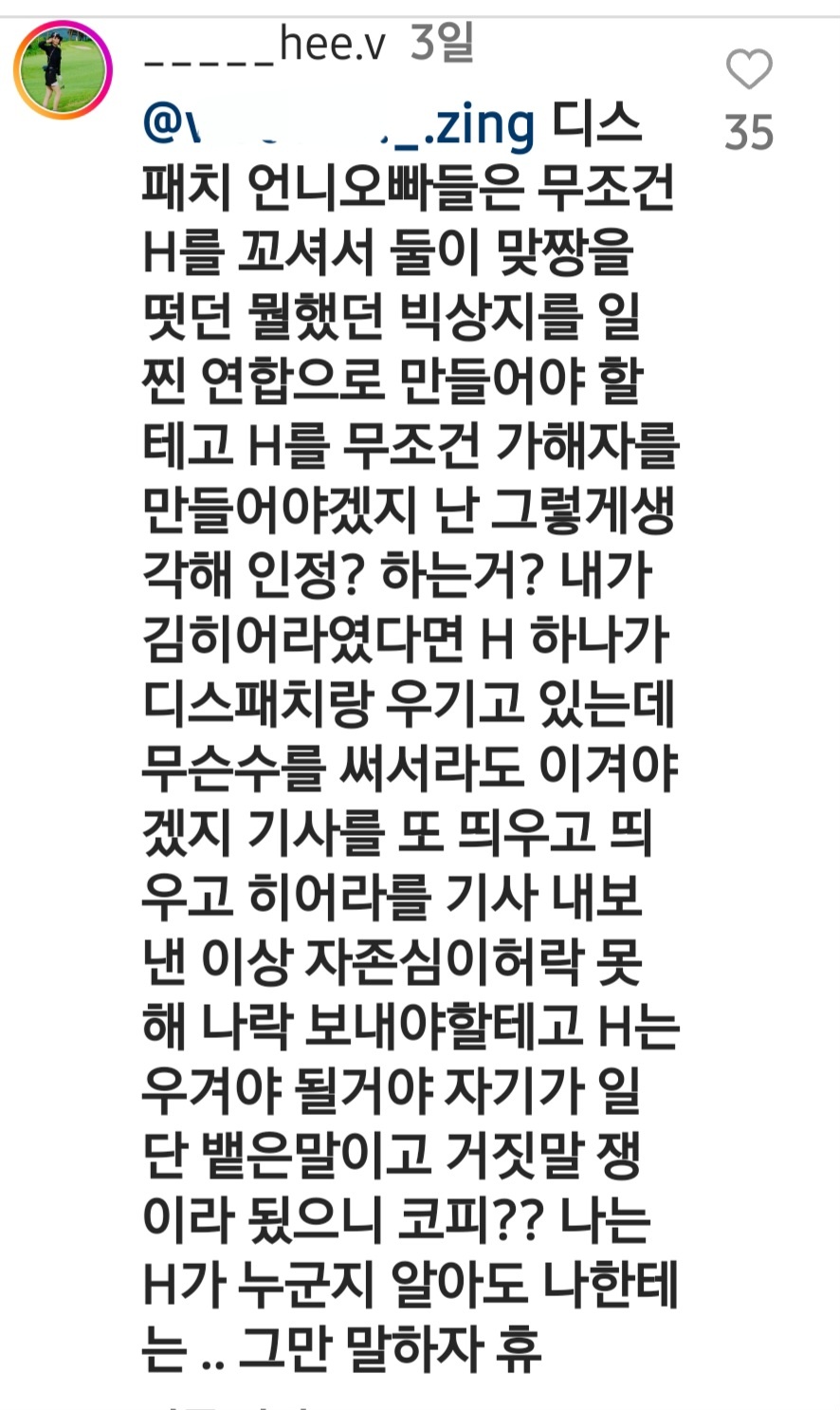3. 그것을 안 디스패치는 그럼에도 불구하고 빅상지=일진=김히어라의 등식으로 만들었고 제보자들 처음 말을 기사화 했다.
