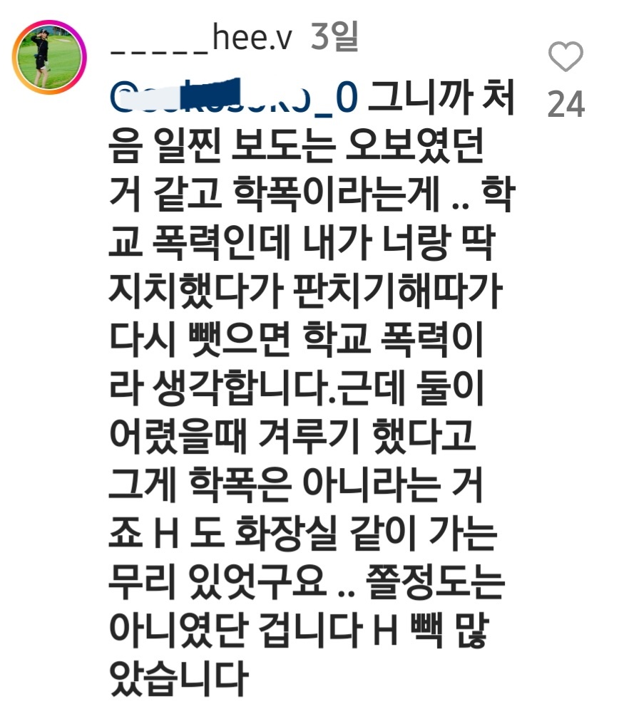 “H 씨가 학교폭력 피해자로 둔갑한 걸 보고 너무 놀랐다. 그때 우리 학교 나온 사람은 다 알 거다. 누가 가해자인지.