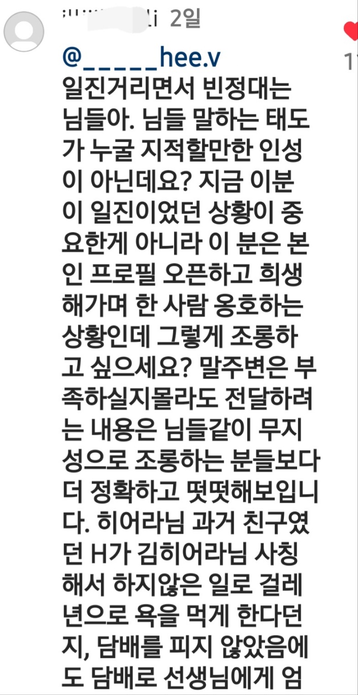 A씨는 “나는 김히어라를 좋아하지 않는다. 두둔하려고 하는 말이 아니”라면서도