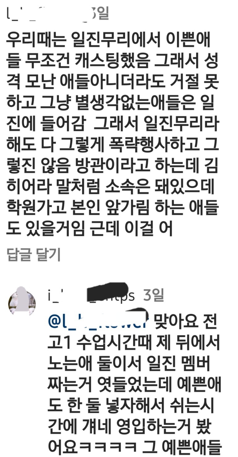 제보자 뿐만 아니라 그 당시 학교 다닌 이들은 김히어라 이름을 다들 알고 있었고 빅상지 멤버라는 것도 알았으니 당연히 김히어라=일진 이란 등식이 성립 했을 것이고 빅상지 일진들이 벌인 일들안에 김히어라도 당연히 퍼함 되었을거라는 합리적 추론이 성립 된거라고 봅니다.
