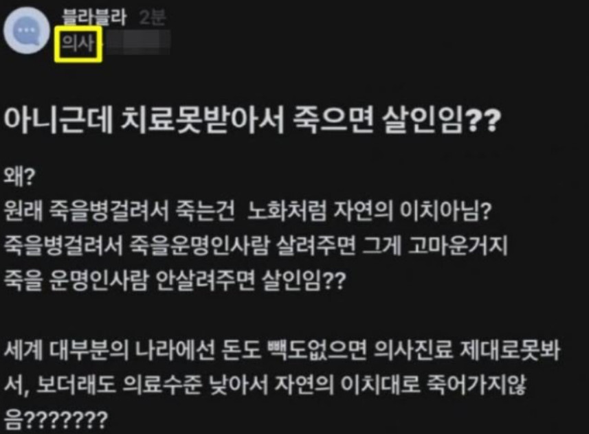 이 일반인이 알아채기 힘든 지옥의 매트릭스를 구성해놓고 본질은 철저히 가리며 감성적인 글로 대중을 선동하는 것이 의사 집단의 실체라고 할 수 있으니 그야말로 고학력 화물연대라는 말이 괜히 나온 것이 아니다.
