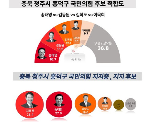 국힘당은 현재 후보들이 많지만 대략 송태영 전 충북도당위원장, 김동원 전 국무총리실 국정홍보 자문위원 싸움이 아닐까 싶다
