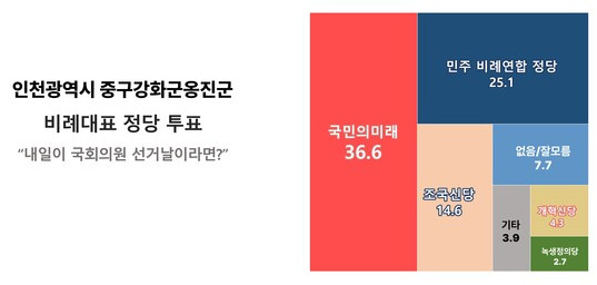 중구(민주 43.7%, 국힘 35.8%), 강화군(국힘 51.4%, 민주 30.4%), 옹진군(국힘 44.2%, 민주 35.4%)