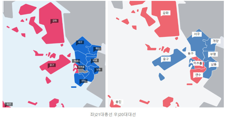 중구는 왔다갔다 하지만 강화와 옹진은 굳건한 국힘당 지지.