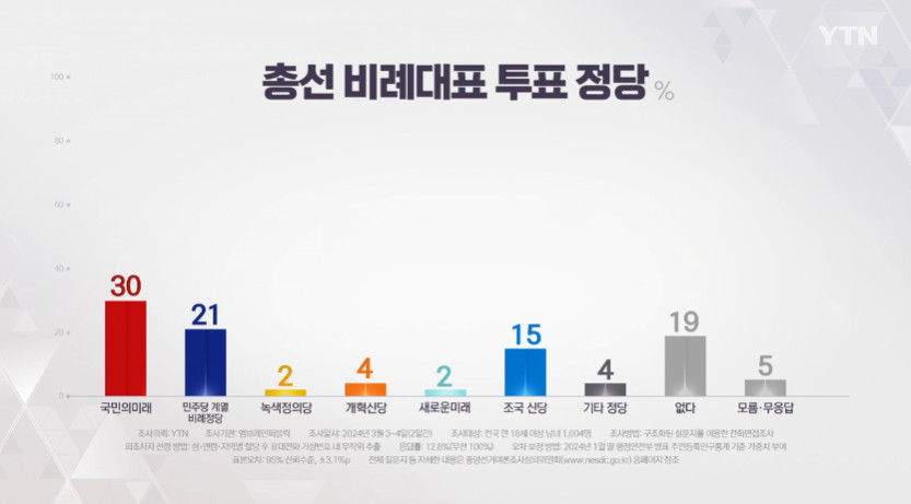 국민의미래(40대 15%, 50대 24%)와 더불어민주연합(40대 29%, 50대 19%)을 앞질렀다.
