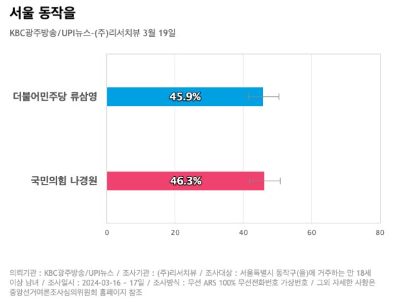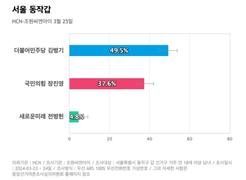 동작갑은 민주당 김병기와 국힘당 장진영 여론조사를 보면 장진영의 우세로 나온다