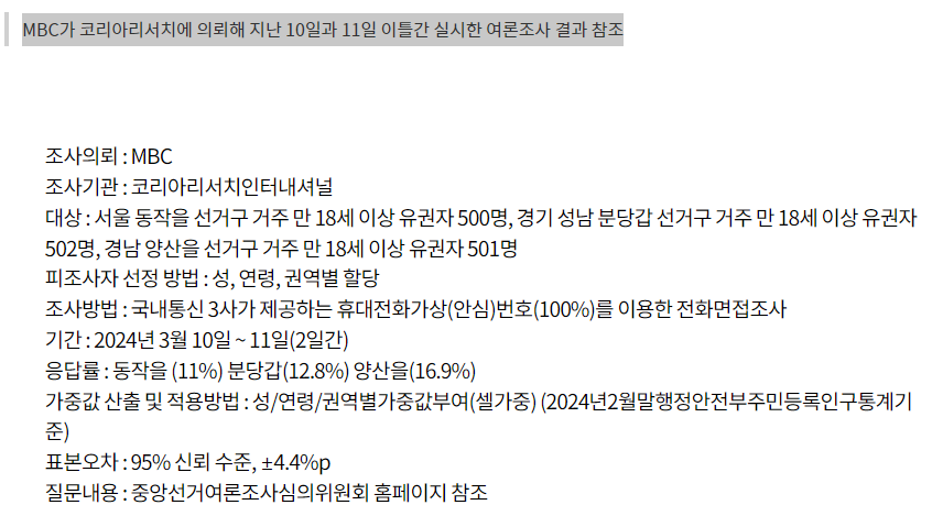 | [22대총선]동작을 여론조사 나경원 류삼영 / 동작갑 김병기, 장진영 (2) | 2024.03.12 |