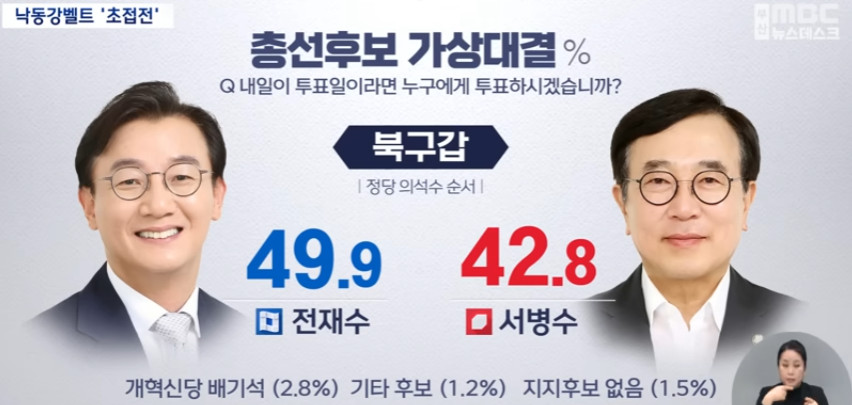 북구가 갑을로 나누어 지고 처음 맞는 국회의원 선거인데 초접전 중이다