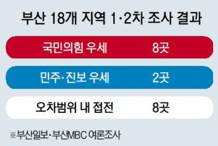 <조사개요>조사 기간 : 2024.3.18.-19(2일간)조사 대상 : 부산광역시 각 지역별 거주자 만 18세 이상 남녀조사 방법 : 무선 자동응답(ARS) 조사피조사자 선정 방법 : 무선(100%)-통신사 제공 휴대전화 가상번호 활용가중치 산출 및 적용방법 : 2024년 2월말 기준 행정안부 주민등록 인구통계기준, 셀가중의뢰기관 및 조사 기관 : 부산일보/부산MBC KSOI(한국사회여론연구소)