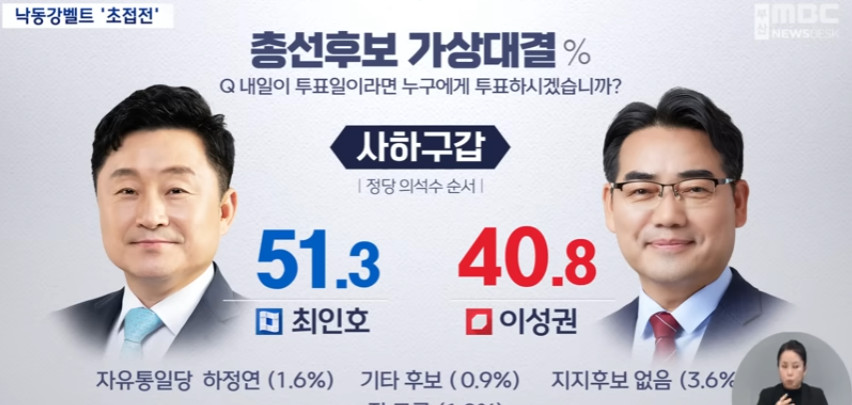 민주당 현역의원 최인호가 전 부산시 경제부시장 국민의힘 이성권을 압도하고 있다.