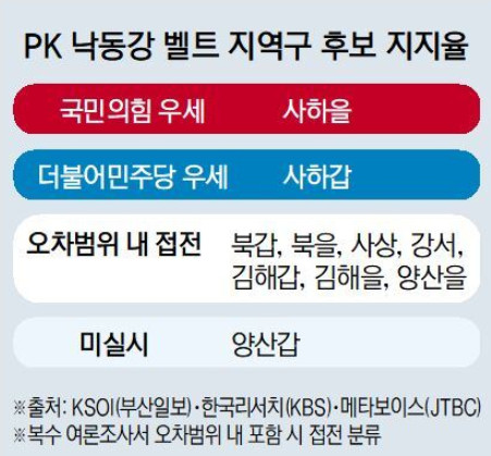 오차 범위내 접전인 곳 또한 국힘당 우세가 많다.