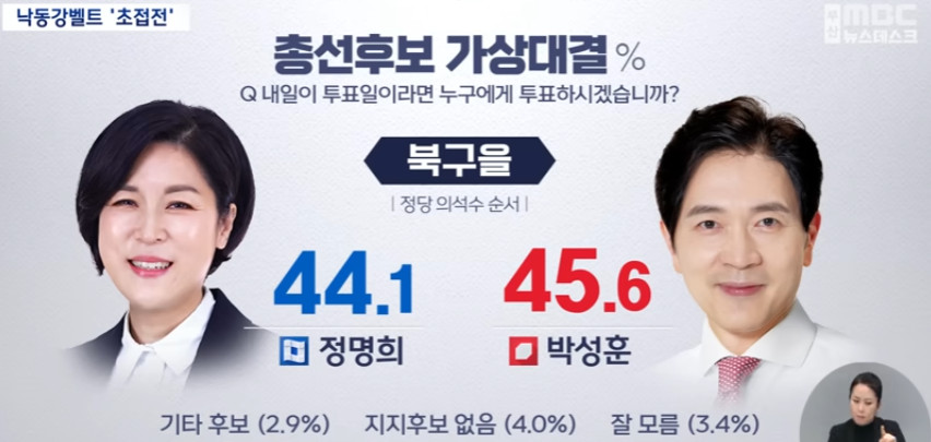 현재 정명희와 초접전의 이유는 정명희는 북구청장 경력이 있어 북구에 대한 이해도가 높음. 또한 정명희는 북구 이름을 바꿀려는 기획을 했었음. 이건 젊은 층에 호응도가 상당히 높았음. 더군다나 민주당 전재수가 있던 지역이 넘어 왔고 전재수가 지역을 잘 챙긴 이점을 정명희가 보고 있음.