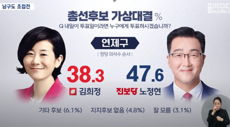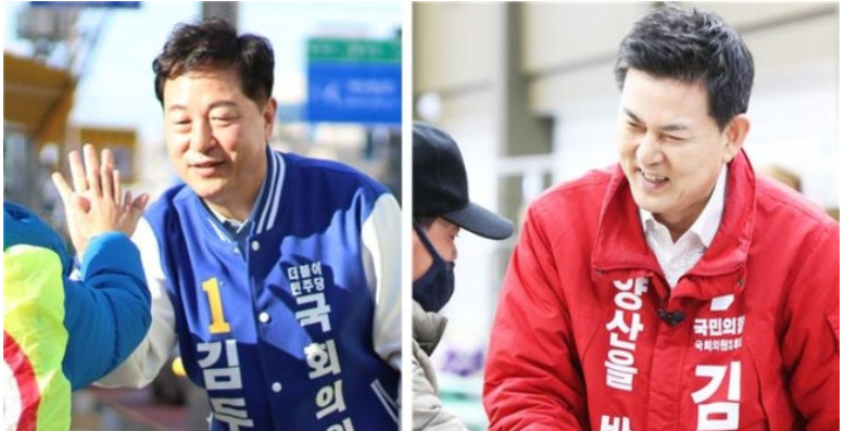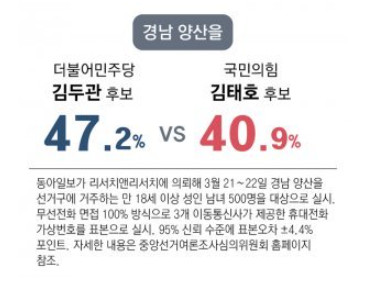 양산을은 김두관 42.4%, 김태호 35.1% 김두관이 앞서고 있다