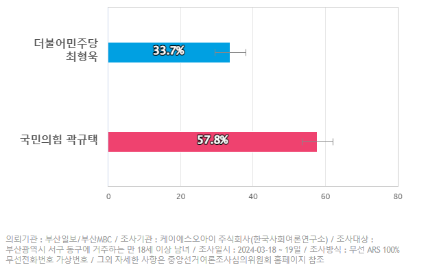 그외 부산 MBC가 총선 D-30일을 맞아 한국사회여론연구소(KSOI)에 의뢰, 지난 8~9일 부산 9개 지역구에서 실시한 여론조사(만 18세 이상 남녀 4538명, 표본오차는 95% 신뢰수준 ±4.3~4.4%P)을 보면