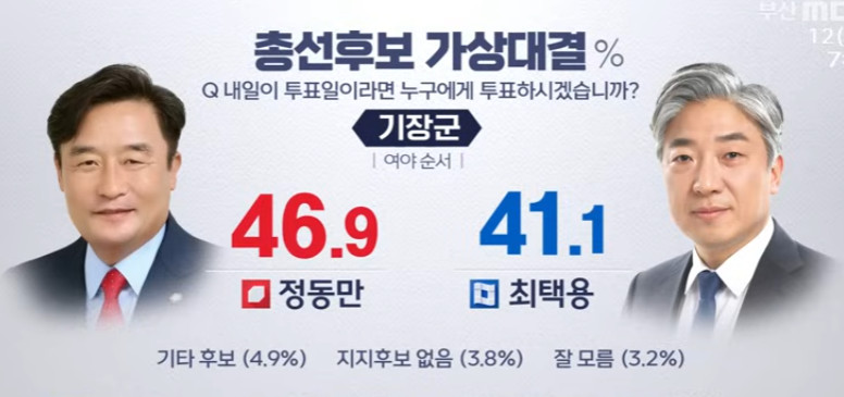 기장은 국힘 정동만이 앞서고 있긴 한데 오차범위 안이다.