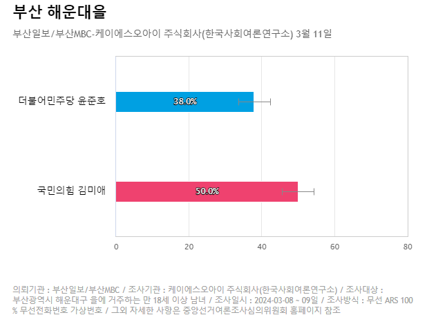 국민의힘 김미애 50%, 더불어민주당 윤준호 38%로 차이가 크다.