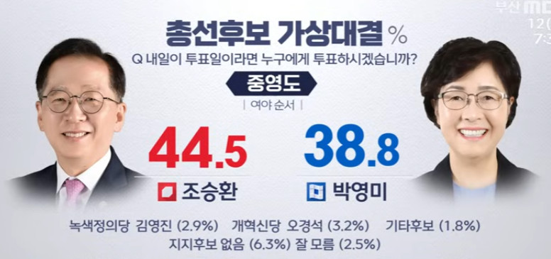 불륜으로 인해 재선은 일치감치 사라진 황보승희 대신 국힘당은 후쿠시마 원전 오염수가 안전하다는 해수부장관의 조승환이 출마를 했고 민주당은 오래도록 영도에서 시민활동을 한 데레사 여고 서울대 출신의 박영미가 출마했다.
