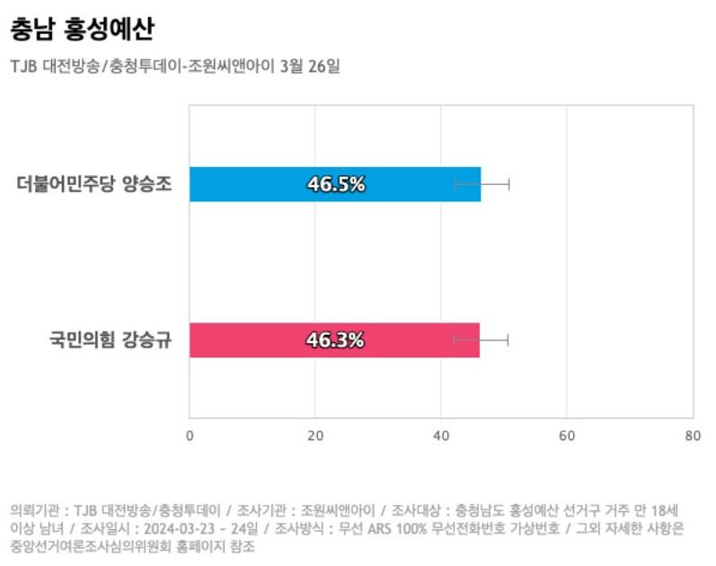 더불어민주당 양승조 후보 46.5%, 국민의힘 강승규 후보 46.3% 초 박빙이다.