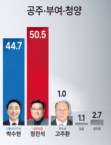 민주당 박수현 후보는 44.7%, 지역구 현역인 국민의힘 정진석 후보는 50.5%
