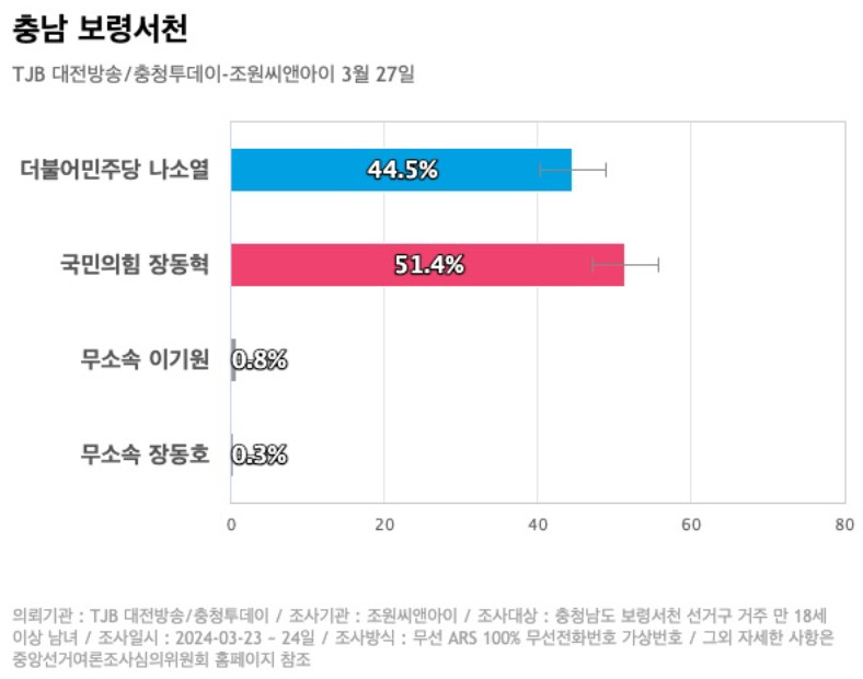23일 국힘 장동혁 후보 51.4%, 민주당 나소열 후보 44.5%,