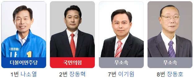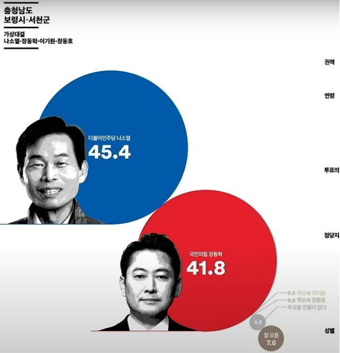 민주당 나소열은 제42-44대 충청남도 서천군수를 지냈기에 서천에서는 많은 지지율이 있었지만 인구가 서천 두배 넘는 보령은 국힘당 지지세가 높아 20대 21대 그리고 2년 전엔 장 후보(51.01%)가 나 후보(48.98%)를 2.03%p 차로 꺾은 바 있