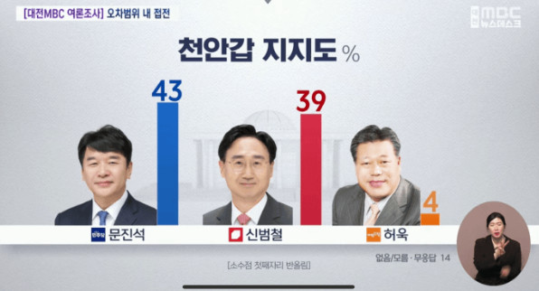 더불어민주당 문진석 후보 43%, 국민의힘 신범철 후보 39%, 개혁신당 허욱 후보 4%