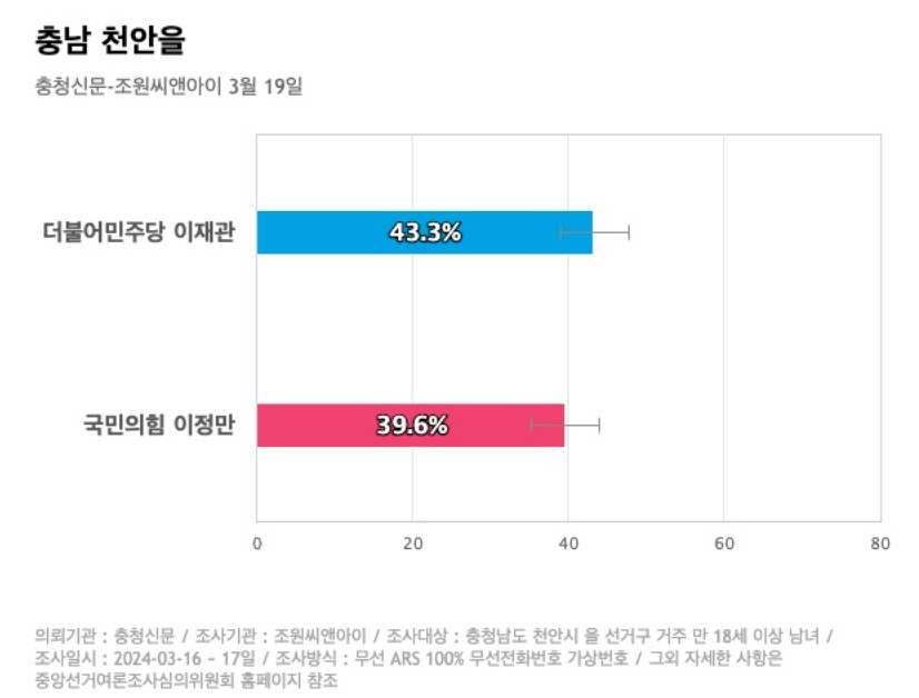 천안을 민주당 이재관 43.3% 국힘당 이정만 39.6%